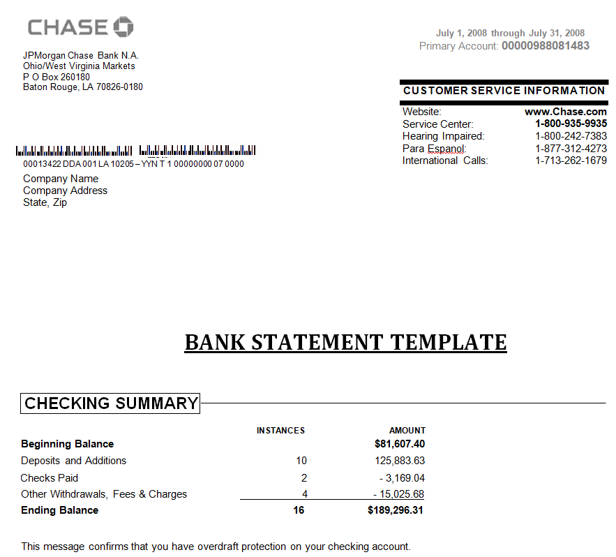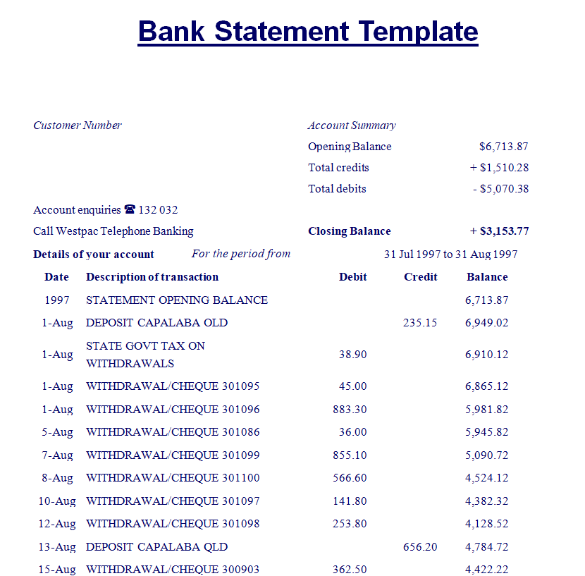 At the end of the bank statement template, you should include a brief summary of the account. This usually includes the opening balance, a sum of all the receipts or deposits, a sum of all the withdrawals, and a closing balance. The sum of all the receipts or deposits is added to the opening balance and the sum of all the withdrawals is deducted from it to reach the figure of ‘closing balance’. The closing balance indicates the amount that is available to the customer in its account at a certain date.