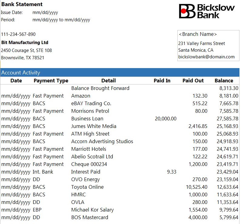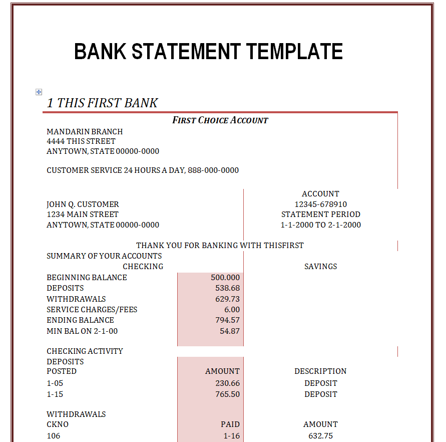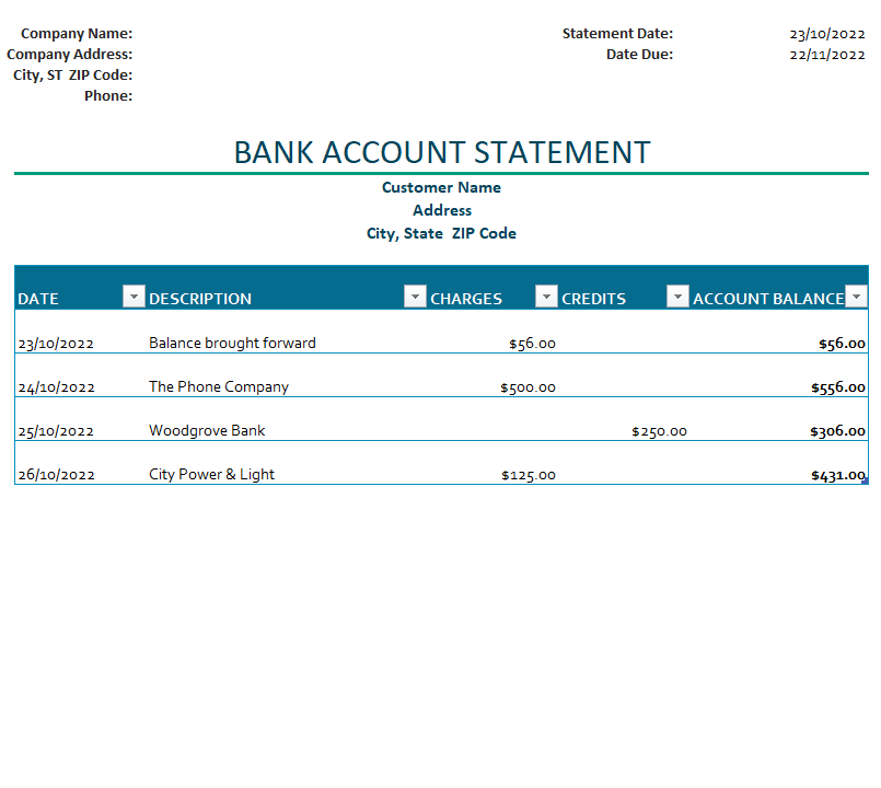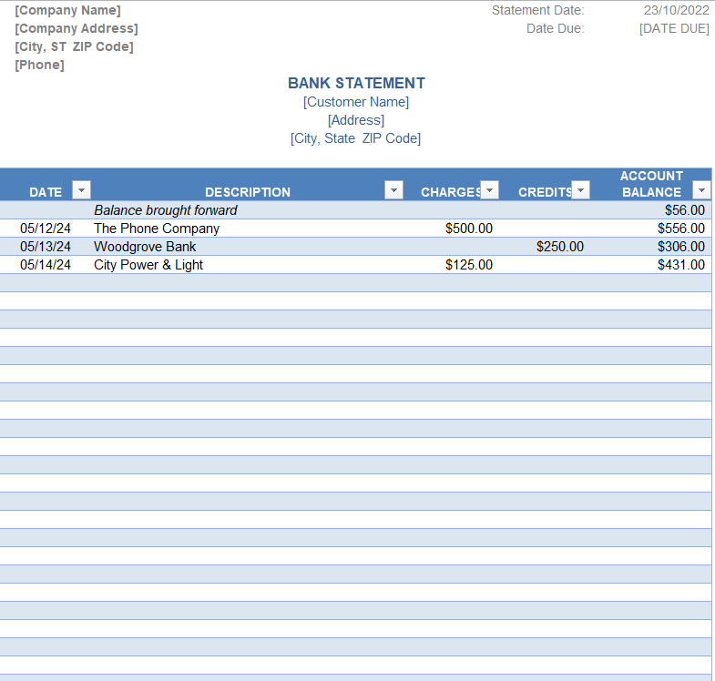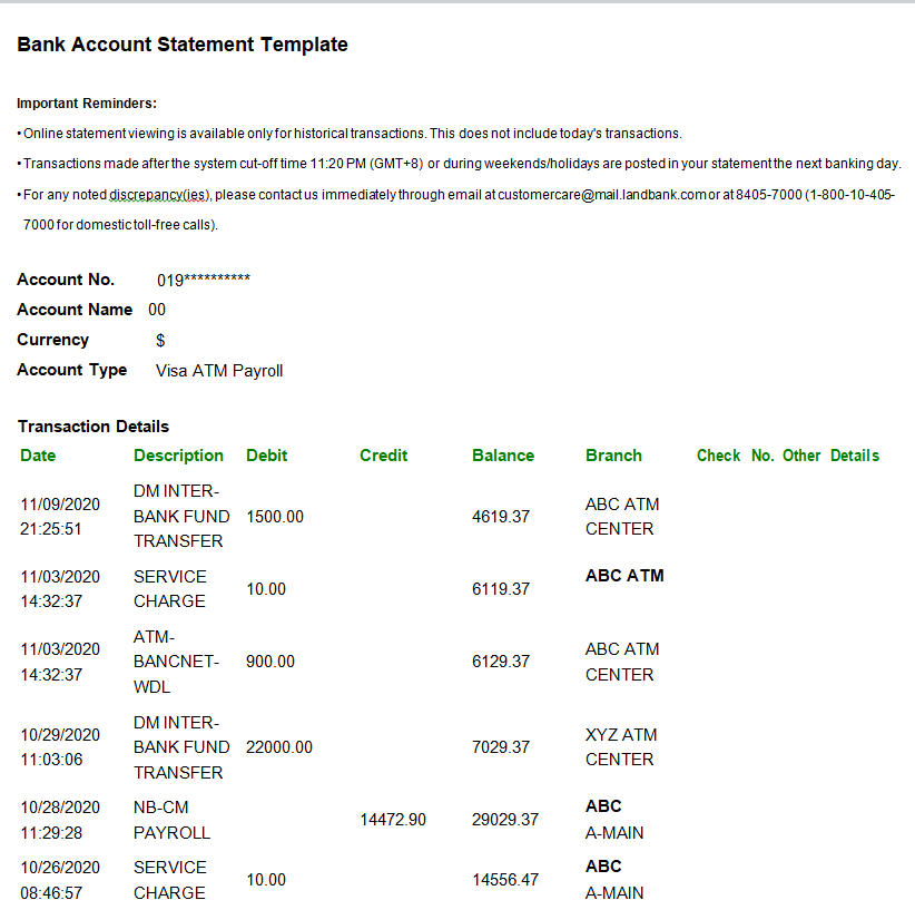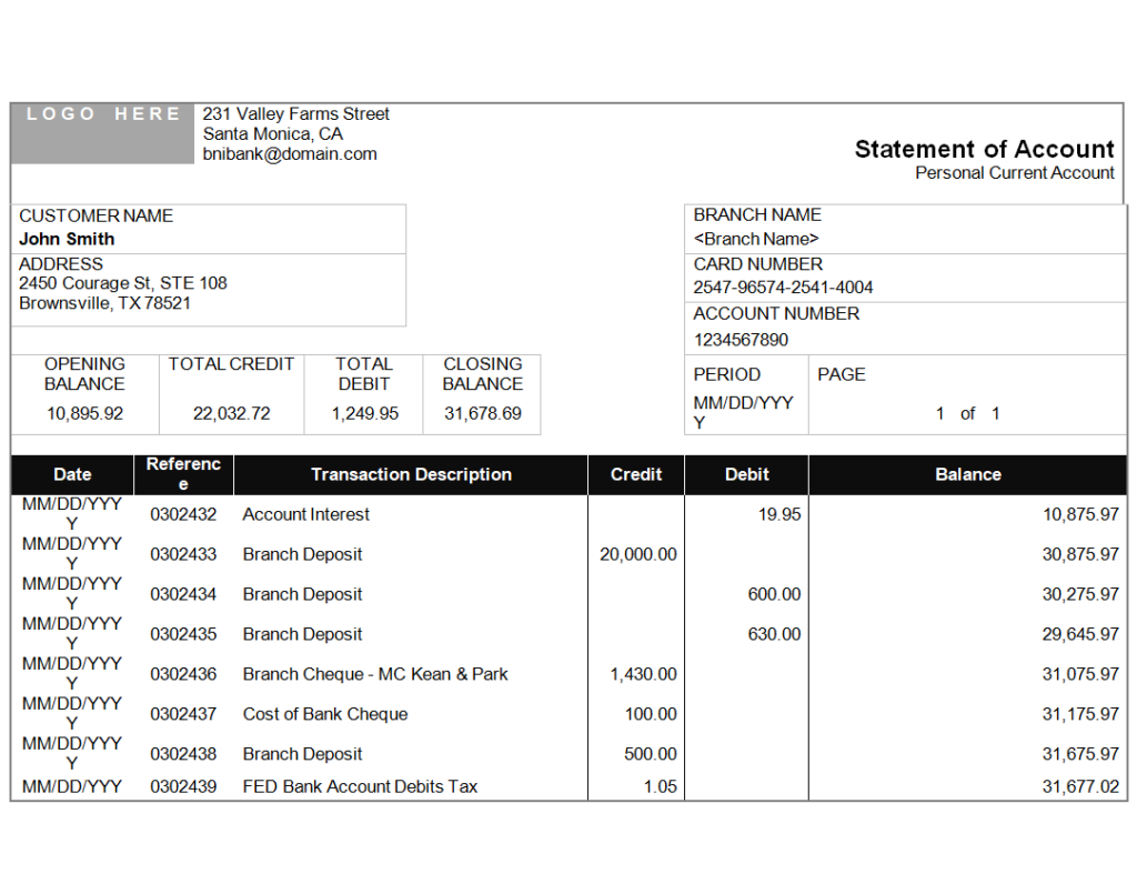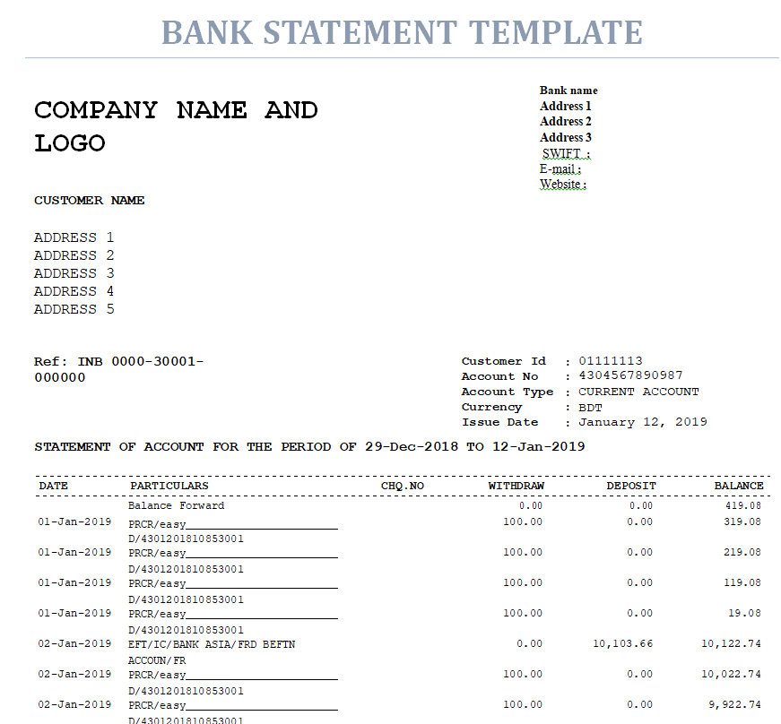 The bank statement template must be created on the official letterhead of the bank. This makes the bank statement official and authentic.