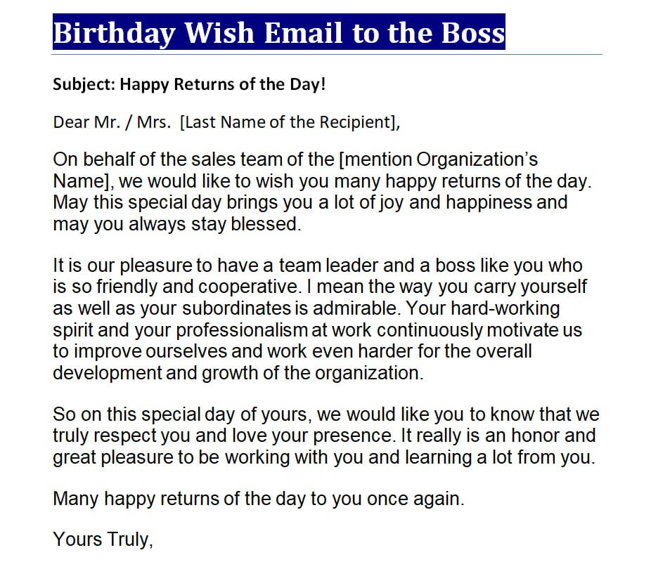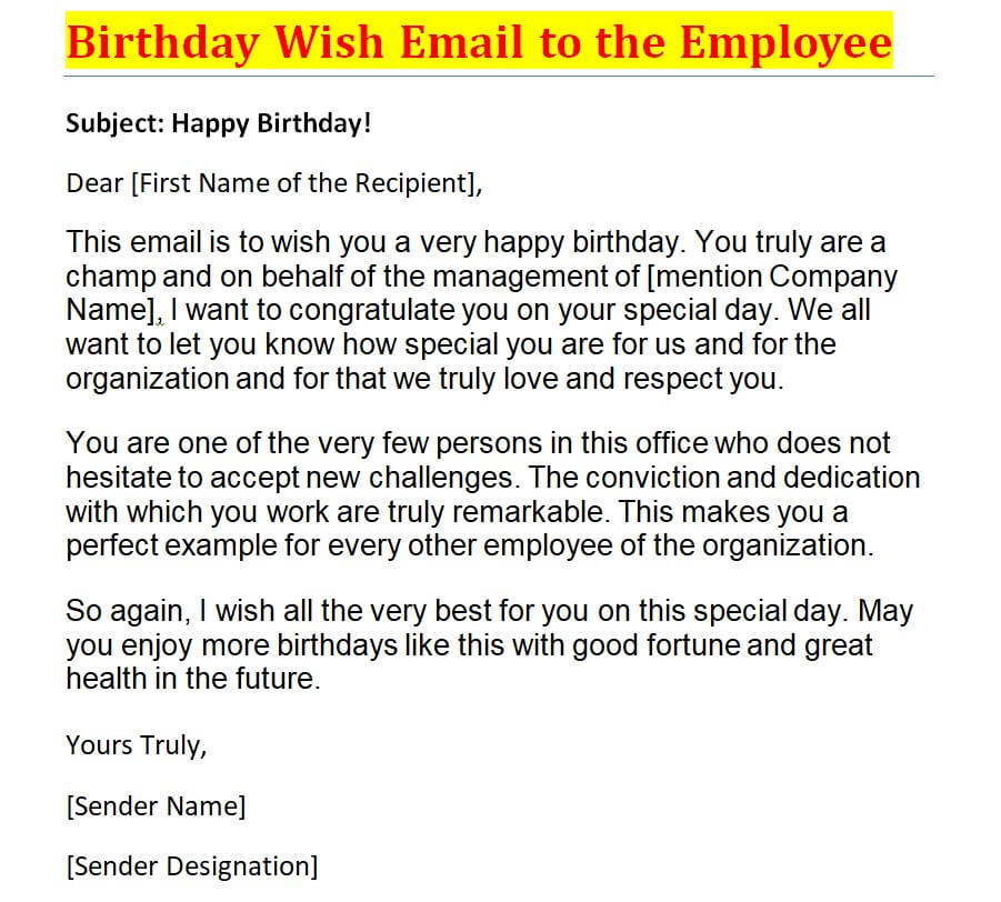 - It is not advised to write a birthday wish message in a completely formal manner even if you are writing such an email to your coworker, employee, boss, or client. You can add some humor in your writing that makes your email message more personalized, joyful, and lovely.