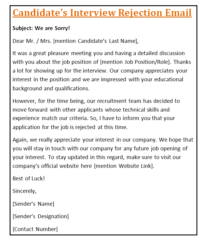 - You should write this type of email within a reasonable time after you have decided to reject an applicant for a job position. This will make the candidate understand that you have thoroughly reviewed their application. Doing so will also help them keep searching for their desired job.