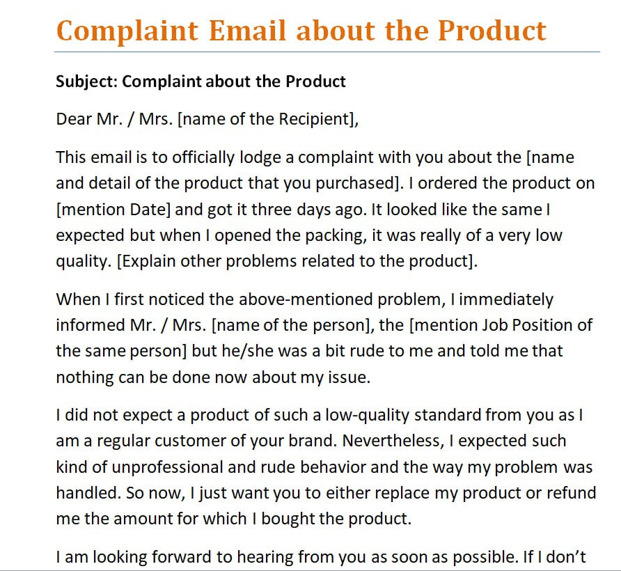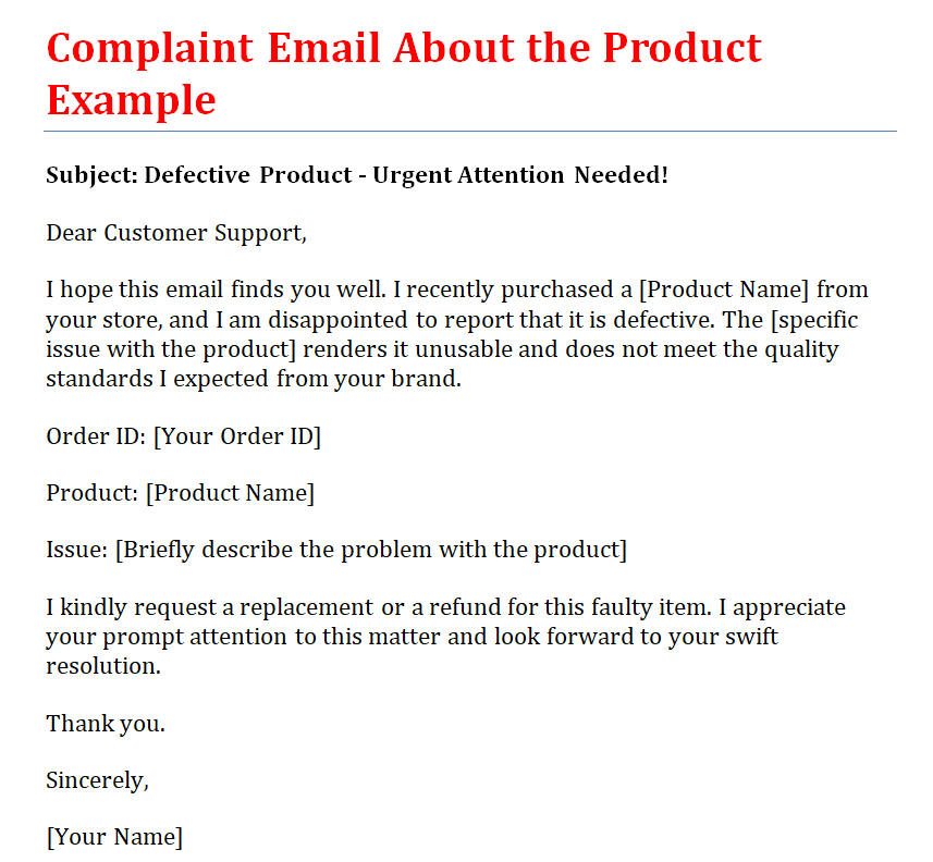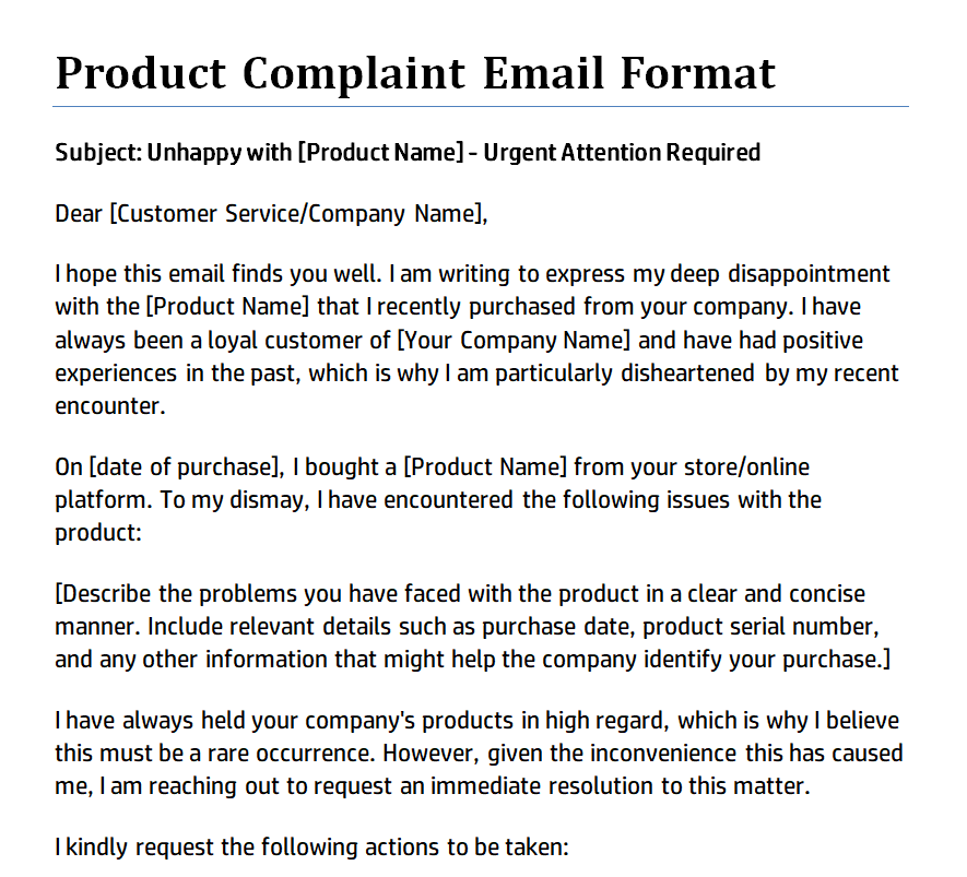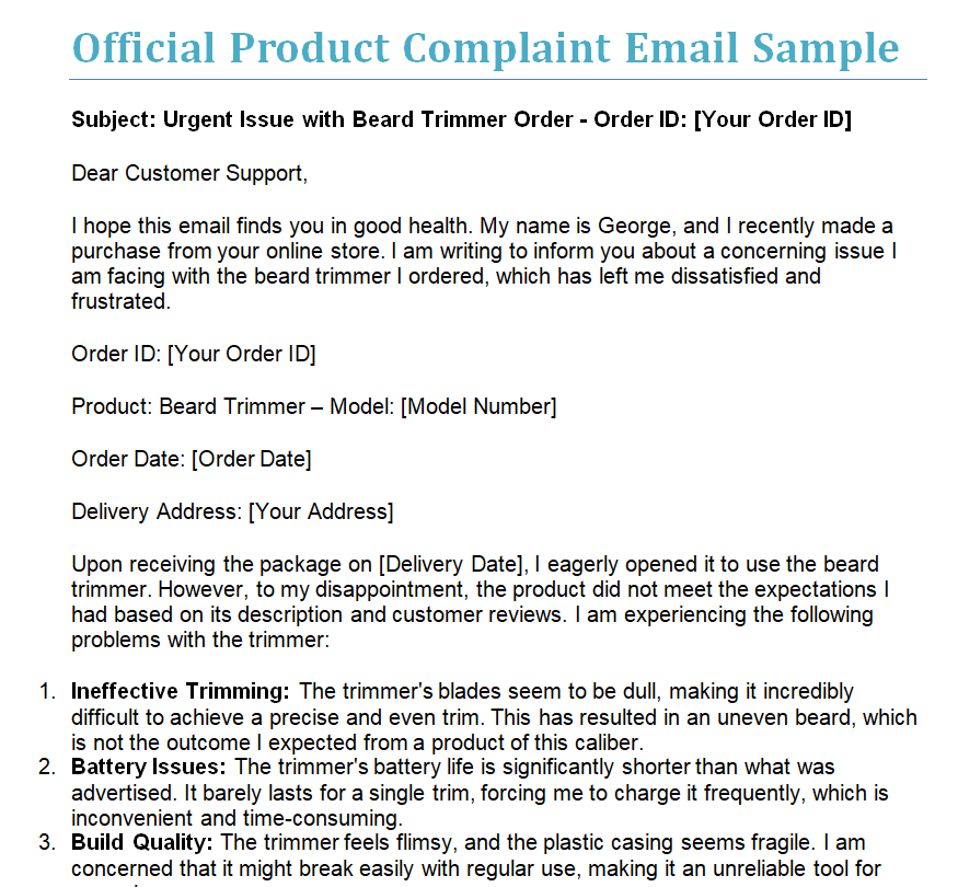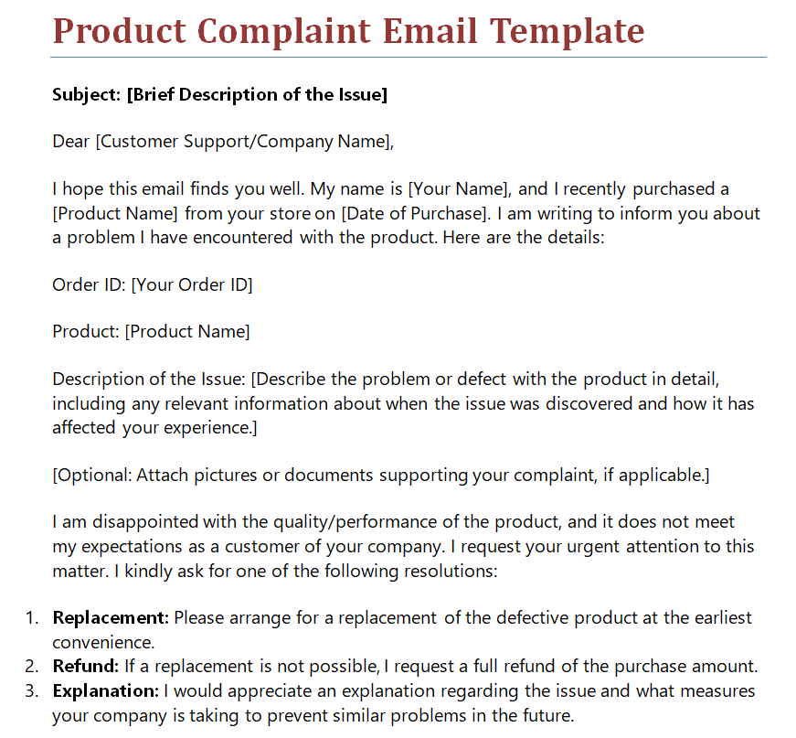 Official Product Complaint Email Sample Doc