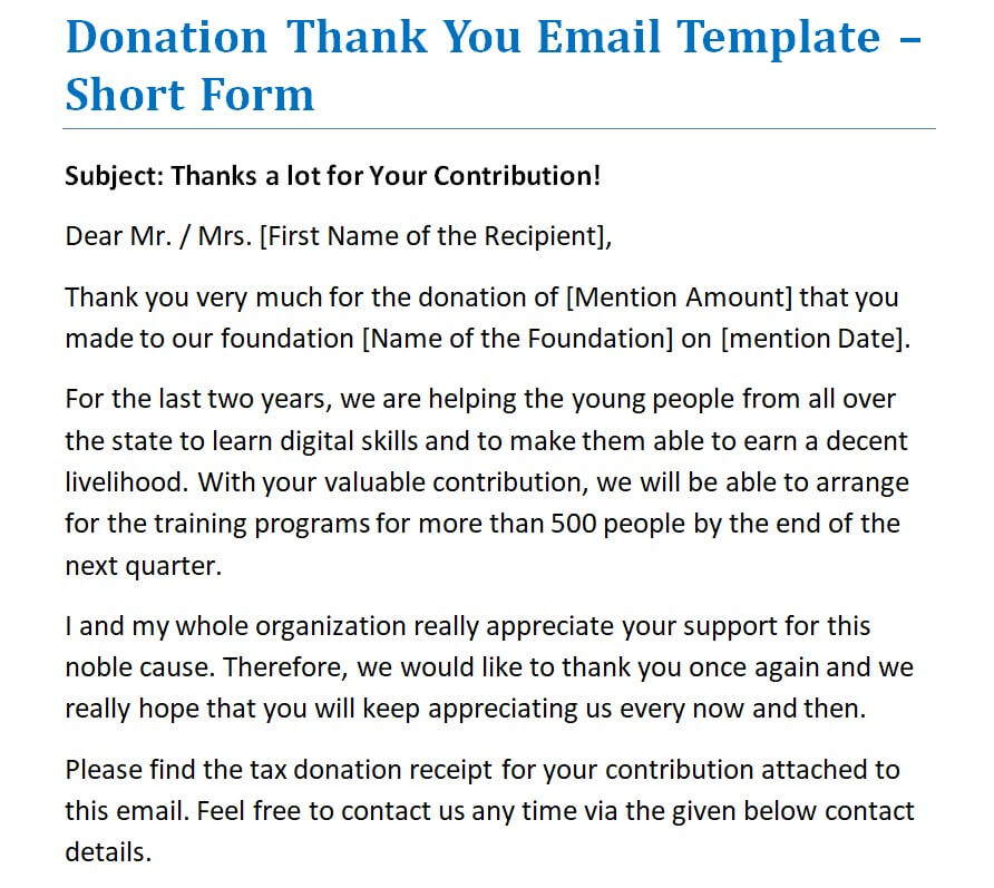 - A donation thank you email is a great source of expressing your gratitude to the contributor.