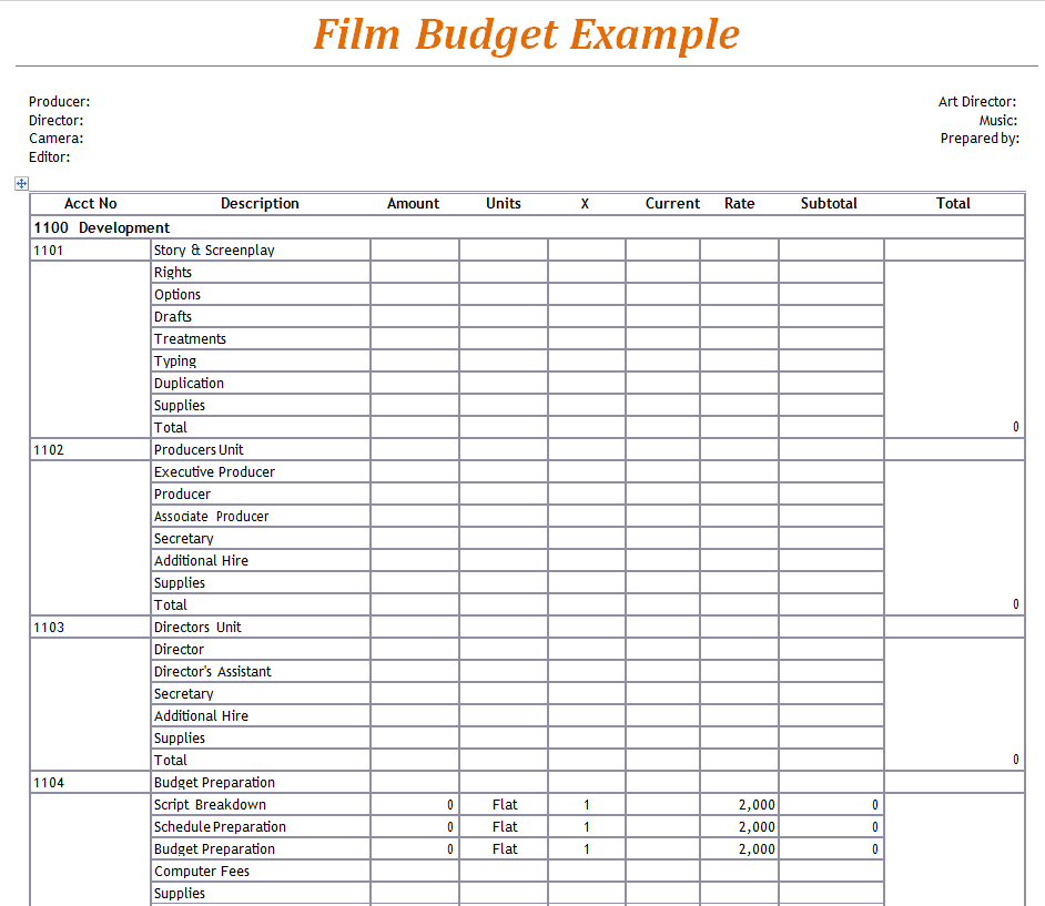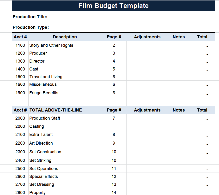 Blank Film Production Budget Template