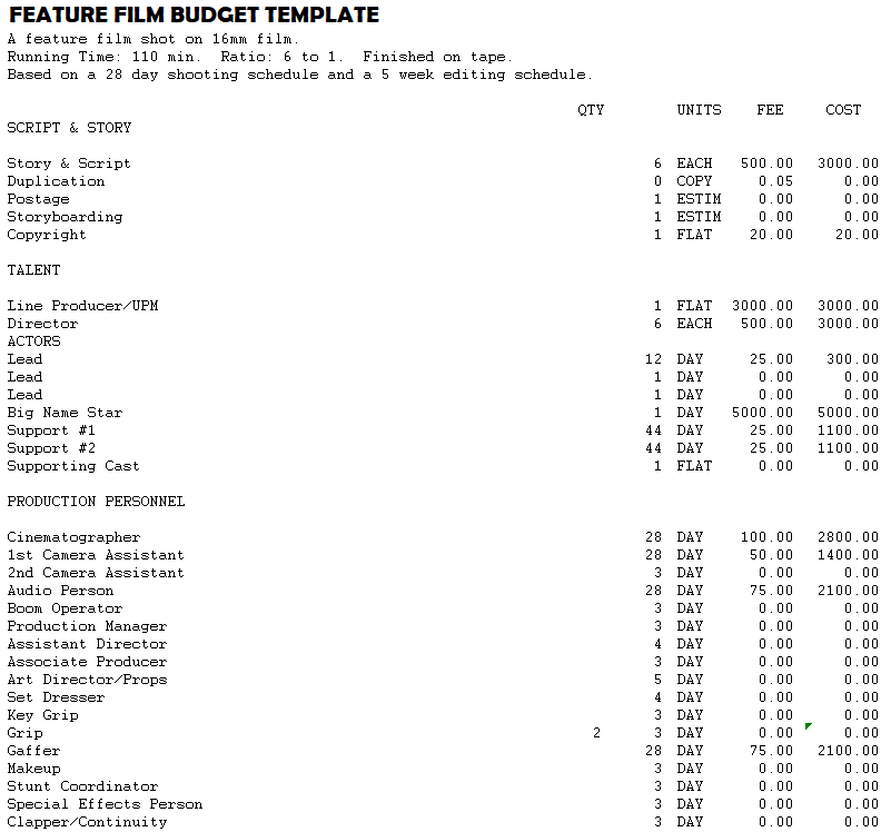 Film Budget Example MS WORD