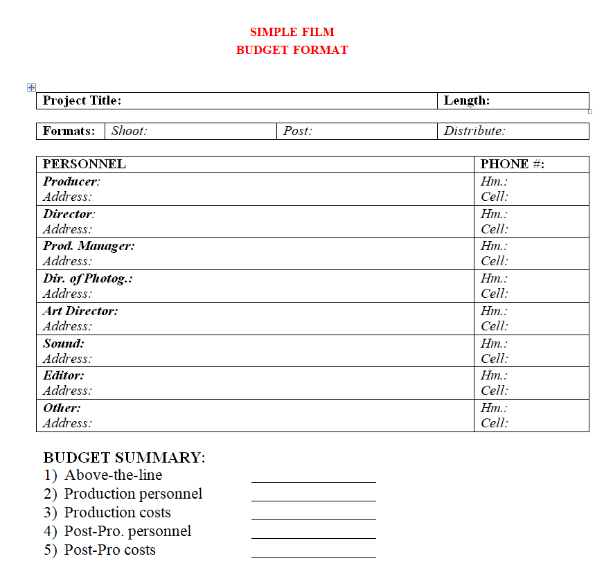 Simple Film Budget Format