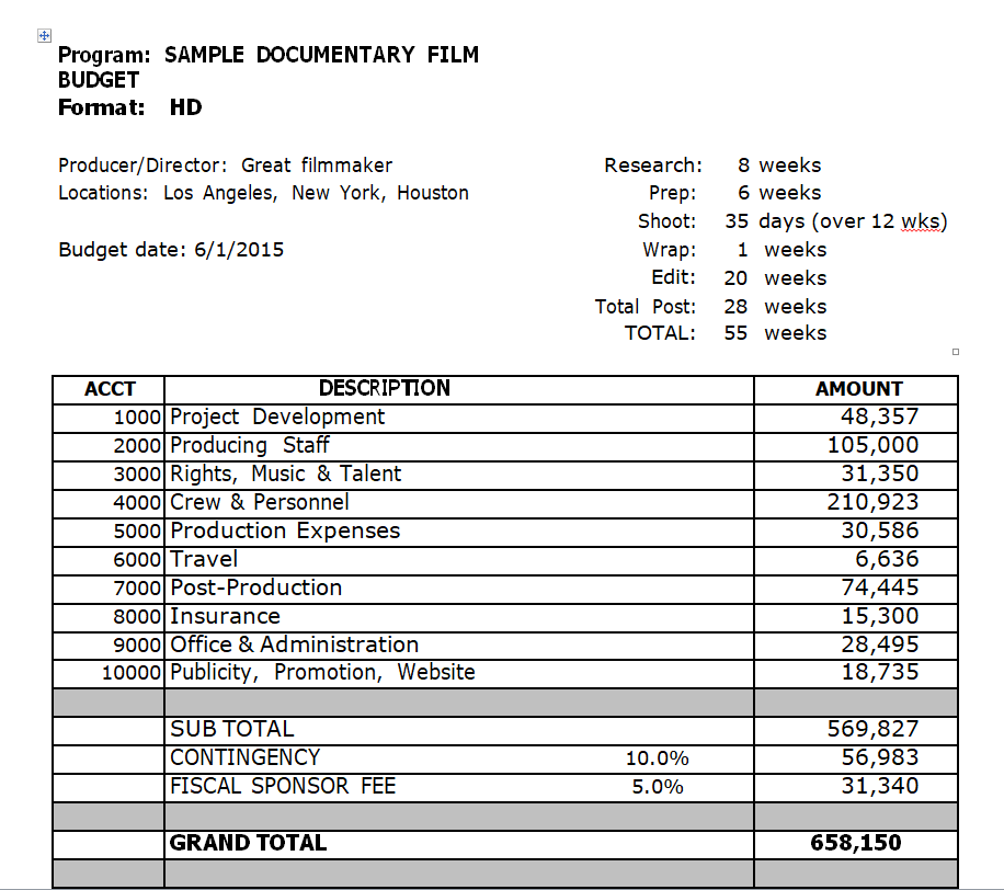 Sample Documentary Film Budget