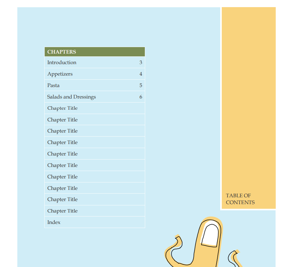 Make sure not to miss the table of contents in your recipe book. It is quite important to include it as it will help the reader to easily track the dish that they want to make on a particular day or event.