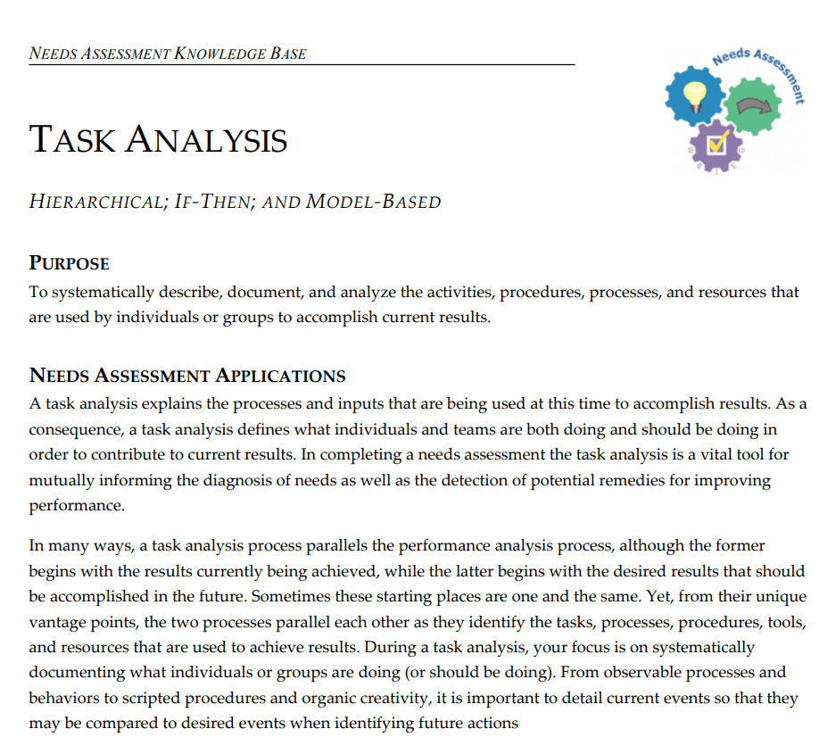 - Not only the task analysis helps in identifying the resources that are required, but it also helps you to improve the existing resources.